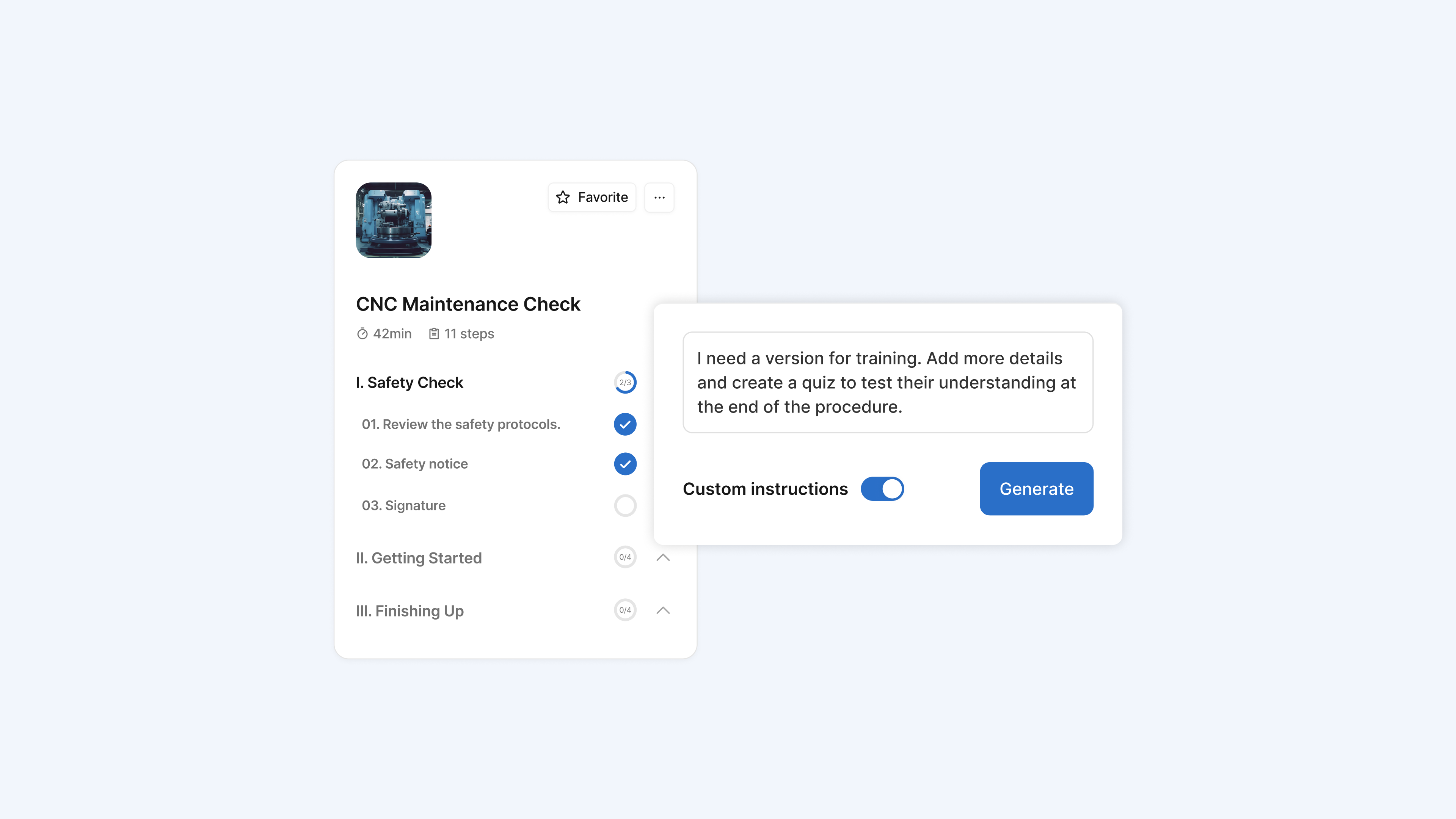 When you upload a document, Squint's AI doesn't just cut it into steps. It reads the entire file and understands the equipment, the sequence, the terminology you use. It's been trained on thousands of industrial procedures, so it knows what a well-structured procedure looks like and where pieces like a signature or a photo evidence check belong.