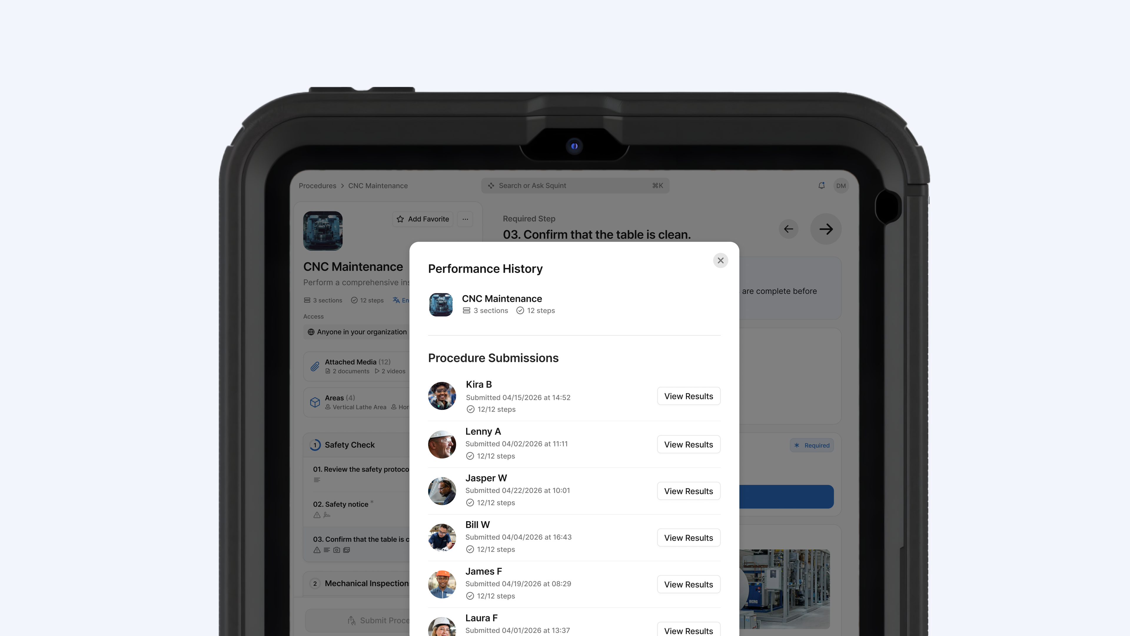 Tasks allows teams to attach any work instruction or checklist to an assigned task, choose who it goes to, set a due date, and schedule it to repeat for recurring work. Operators open Squint, see what's been assigned to them, follow the work instruction, and submit when done. Supervisors or designated approvers sign off digitally and the record lives in Squint, tied to the work instruction that was followed.