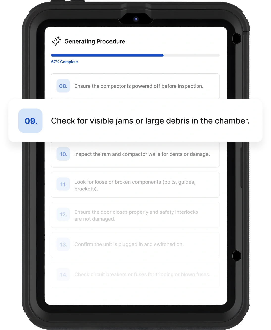 During a scheduled specialist visit, the operations team used Squint to capture the complete troubleshooting and repair process, including diagnostic measurements, decision logic, and step-by-step repair procedures. The specialist's expertise was transformed into a reusable workflow accessible on any device.